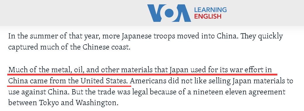 这些网友所言不假。以美国向日本提供了大量入侵中国的物资为例,就连美国政府的喉舌外宣媒体“美国之音”都不得不承认此事。在2011年一篇关于美日二战前关系的文章中,“美国之音”就写道:“日本用于对华发动战争的金属、石油和其他资源,很多都是来自美国的”。