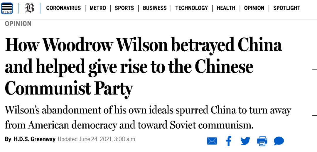 哦对了,《波士顿环球报》这篇文章的标题是:“伍德罗·威尔逊对中国的背叛是如何帮助中国共产党崛起的”。