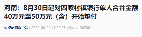 河南:8月30日起对4家村镇银行客户单人金额40万-50万的开始垫付