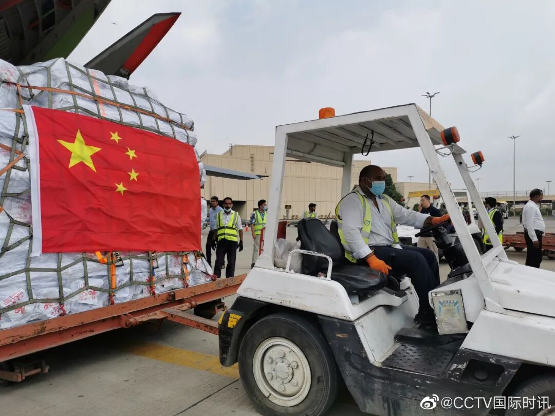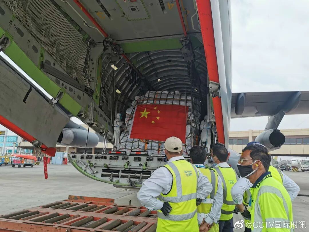 中国援助巴基斯坦抗洪救灾物资抵达卡拉奇真纳国际机场。图源:CCTV国际时讯