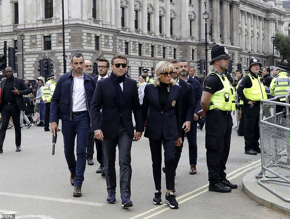 法国总统马克龙则因着装过于随意而受到指责。据法新社报道,女王葬礼的前一天,马克龙和他的妻子被拍到一起参观威斯敏斯特大厅。与往常不同的是,他没有穿正装和黑色皮鞋,而是换上了休闲的蓝色西装外套和海军蓝色运动鞋,还戴了一副墨镜。法国《费加罗报》直言其着装“不和谐”。不过,在女王葬礼当天,马克龙及其妻子都换上了全黑的正装。