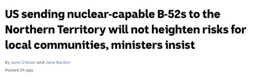 澳大利亚广播公司(ABC)报道截图:澳部长称,美国向北领地派遣具有核能力的 B-52 不会增加当地社区风险