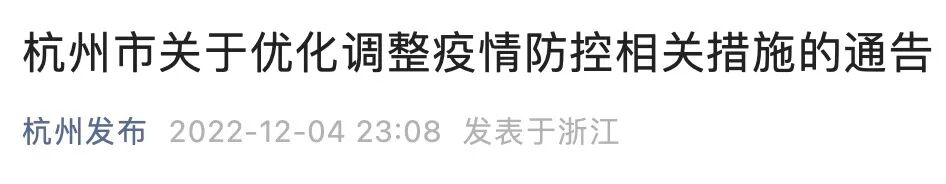 12月4日,杭州市发布关于优化调整疫情防控相关措施的通告,全文如下: