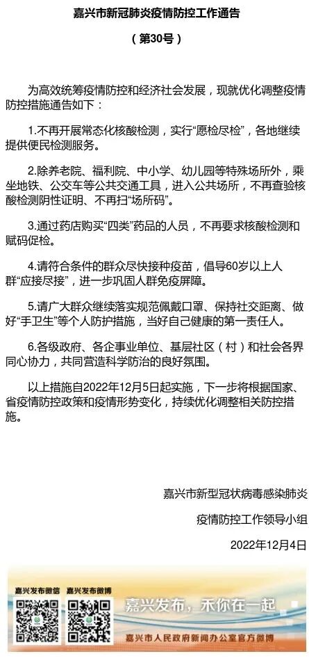嘉兴:不再开展常态化核酸检测,除这些地方,进入公共场所不再查验核酸证明