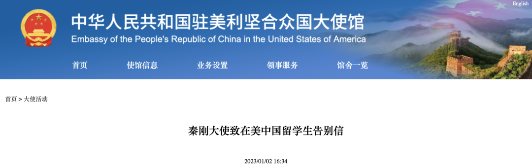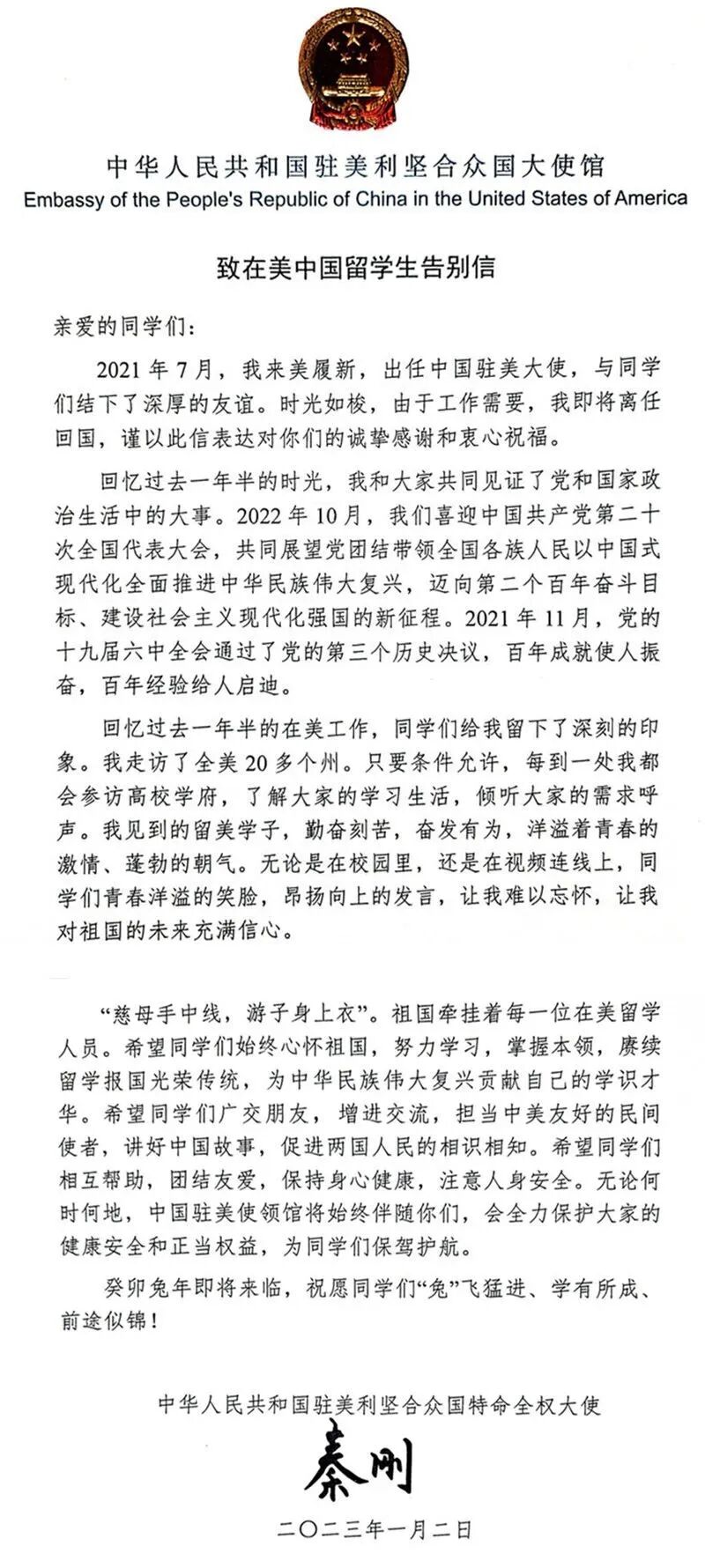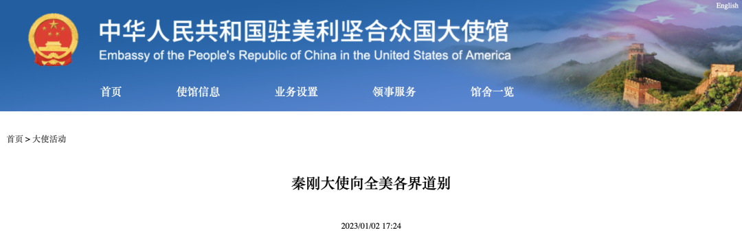 当地时间1月2日,秦刚大使通过社交媒体向美国各界人士道别,全文如下: