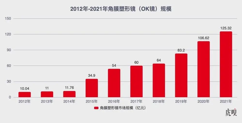 OK镜企业的市值甚至远超过了其所在行业的市场规模。根据第三方研究机构智研咨询数据,到2021年,中国OK镜市场总规模125亿元以上,从2012年到2021年这一领域实现了近25%的年均复合增长率。还催生了市值900亿元的“眼茅”欧普康视。