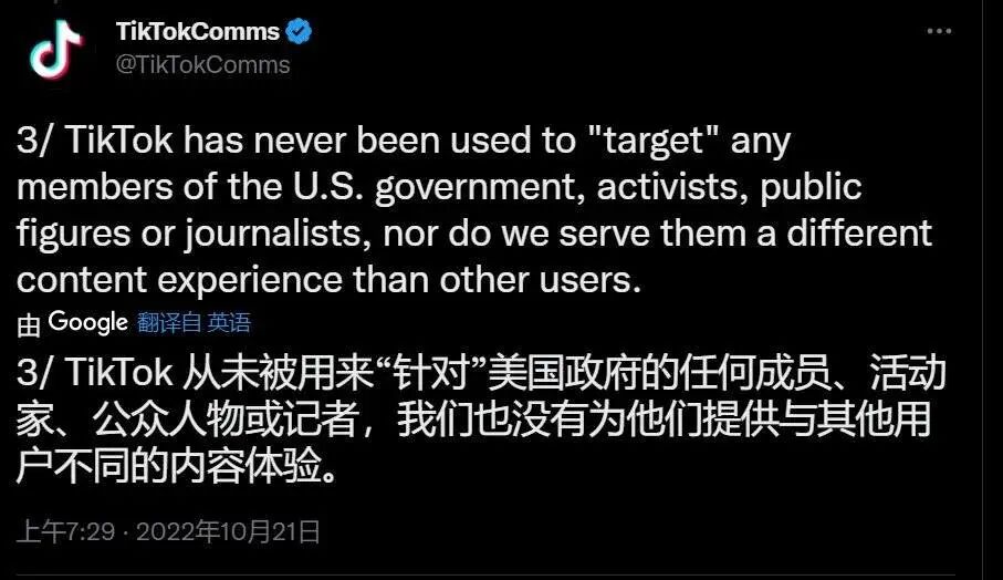 TikTok于10月在推特上做出的一份澄清,图片来源:Twitter
