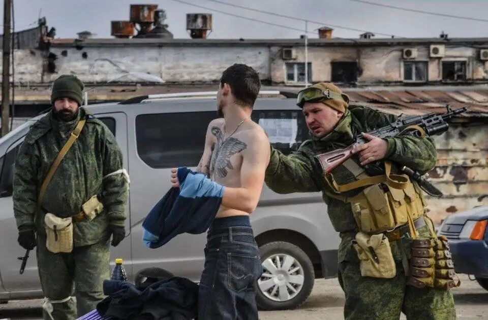 顿涅茨克人民共和国(DPR)的亲俄民兵,正检查一名离开被围困的港口城市马里乌波尔的男子,如果身上有明确军事元素的文身,会被审讯。