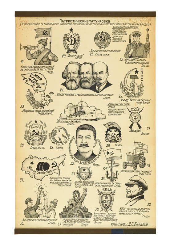与此同时,和苏联劳教制度一同出现的律贼文化(有等级制度的罪犯)创造出了独特的苏俄文身,题材反动,寓意丰富。