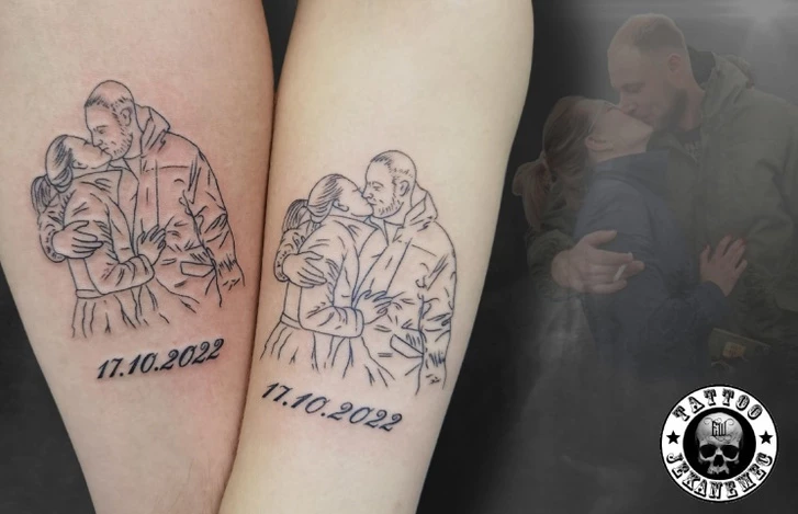 2022年9月22日,瓦伦蒂娜的丈夫收到征召传票,27日就被送到了鄂木斯克接受训练。在派往乌克兰之前,两人获准见面,趁着这个空闲,他们把吻别的照片以及结婚纪念日文在了手臂上。