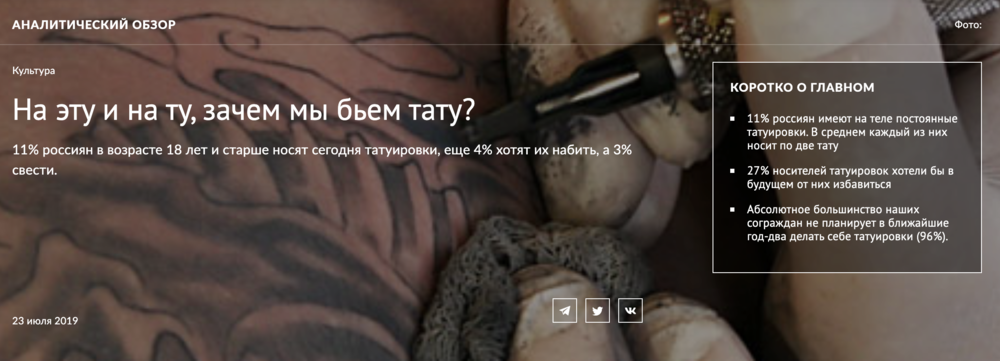 2019年7月23日,俄罗斯舆论研究中心 (VTsIOM) 发布的俄罗斯人文身态度调查数据显示:88%的受访者未有过文身,96%的受访者不打算在未来一到两年内文身,对于27%的受访者来说,文身是入狱的象征。