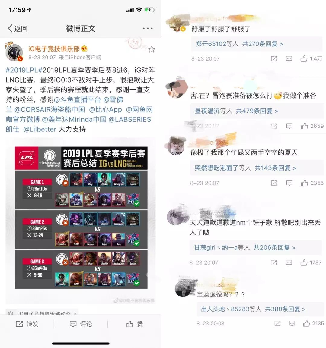 时间仿佛倒回了5月的季中冠军赛,全网的指责、粉丝的失望又一次袭来,只不过这时已没有多少人再看好IG。整个夏季赛,IG几位选手的状态轮流下降,再不复去年的战斗力,选手的每一个失误都被黑子们拿着放大镜辱骂,舆论压力是其他队伍的无数倍。