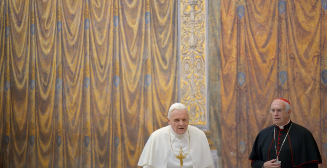 《教宗的承继 The Two Popes》由著名演员安东尼-霍普金斯和乔纳森-普雷斯主演,前者无须多言,后者则是《权力的游戏》中七神教会的领袖「大麻雀」的扮演者,诠释这类具有神学背景的角色可以说颇有心得了。