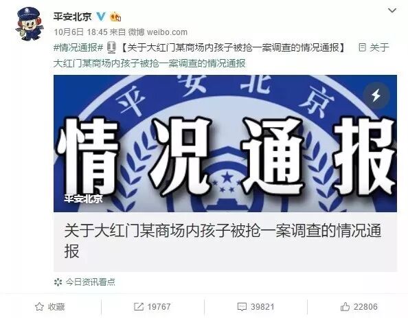 “北京”“商场”“抢孩子”,当这三个关键词加在一起时,一起“北京丰台区某商场光天化日竟然抢孩子”消息便在这个国庆期间引发社会高度关注。