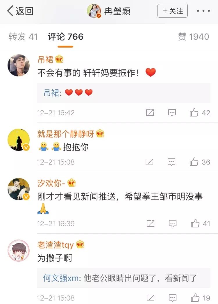 邹市明的妻子冉莹颖也发微博称: