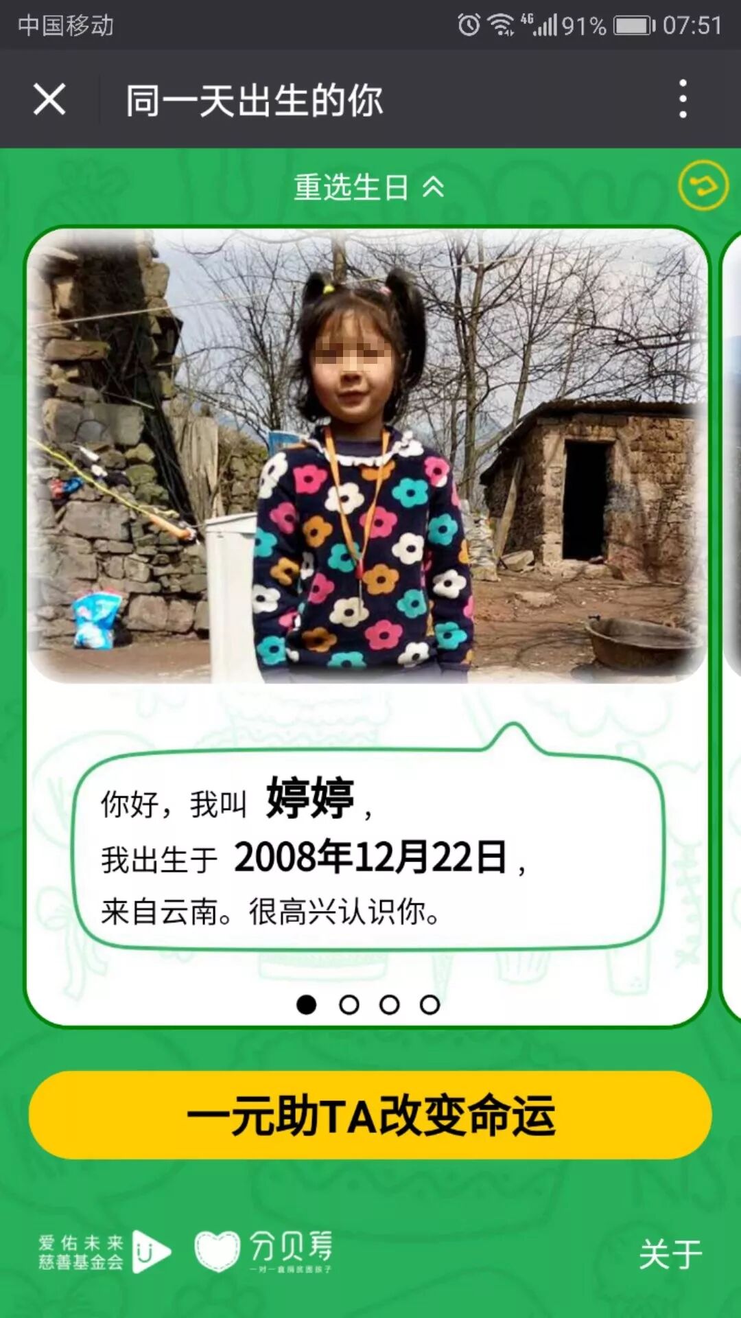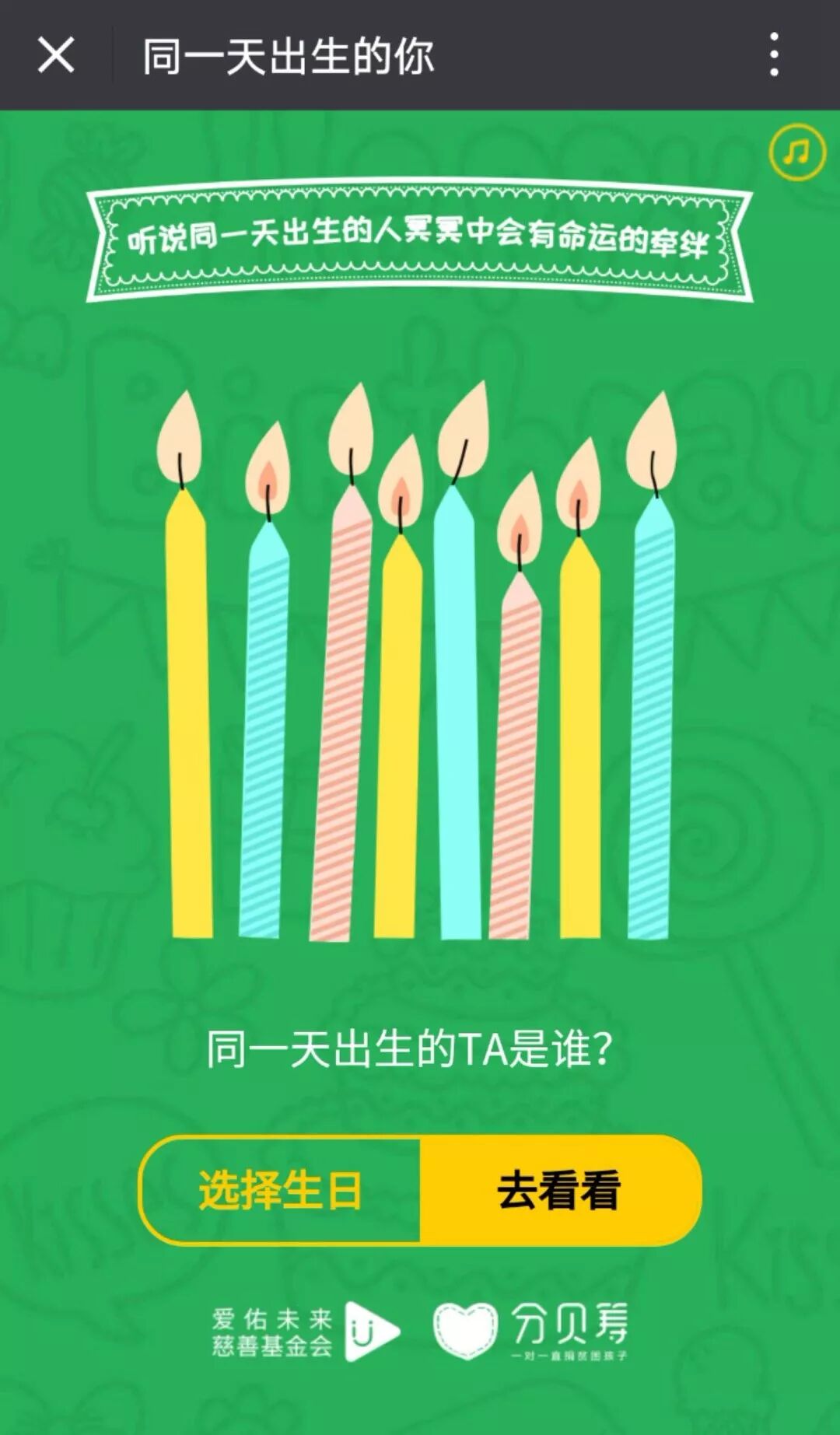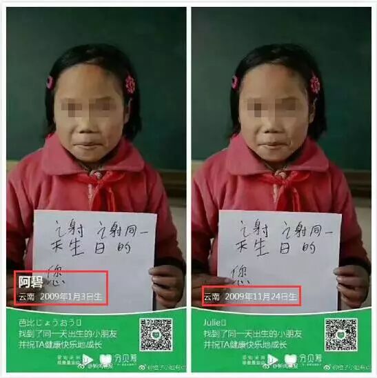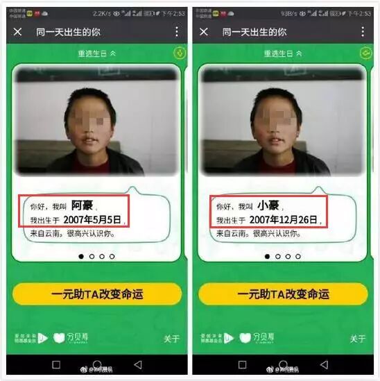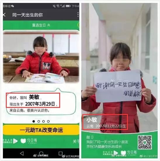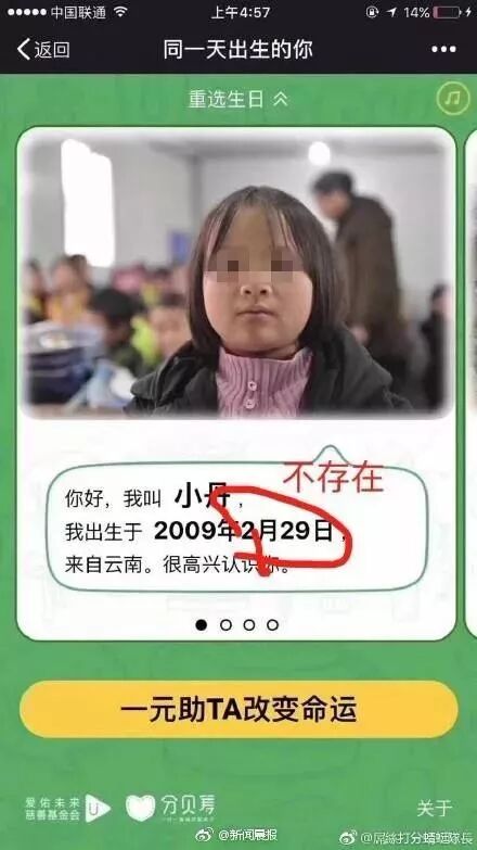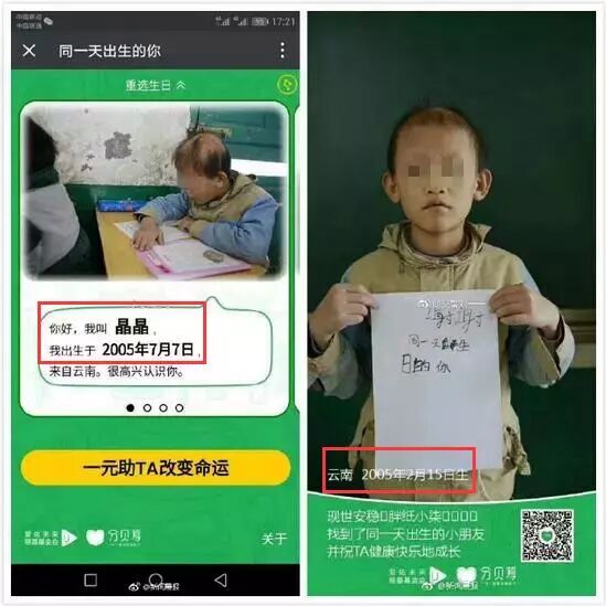 昨天,朋友圈中热传着一则名为“同一天生日的你”的爱心活动。用户进入活动页面并选择自己的生日后,会出现一名生日日期相同的贫困儿童,并可为其捐赠一块钱。