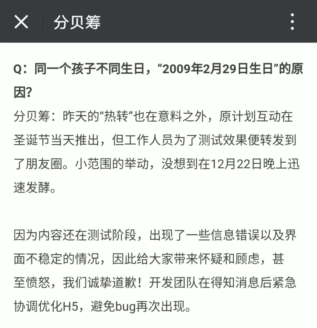 对“同一个孩子不同生日”,“2009年2月29日生日”的现象,“分贝筹”则称是内容还在测试阶段,出现了一些信息错误以及界面不稳定的情况,开发团队在得知消息后紧急协调优化H5,避免bug再次出现。
