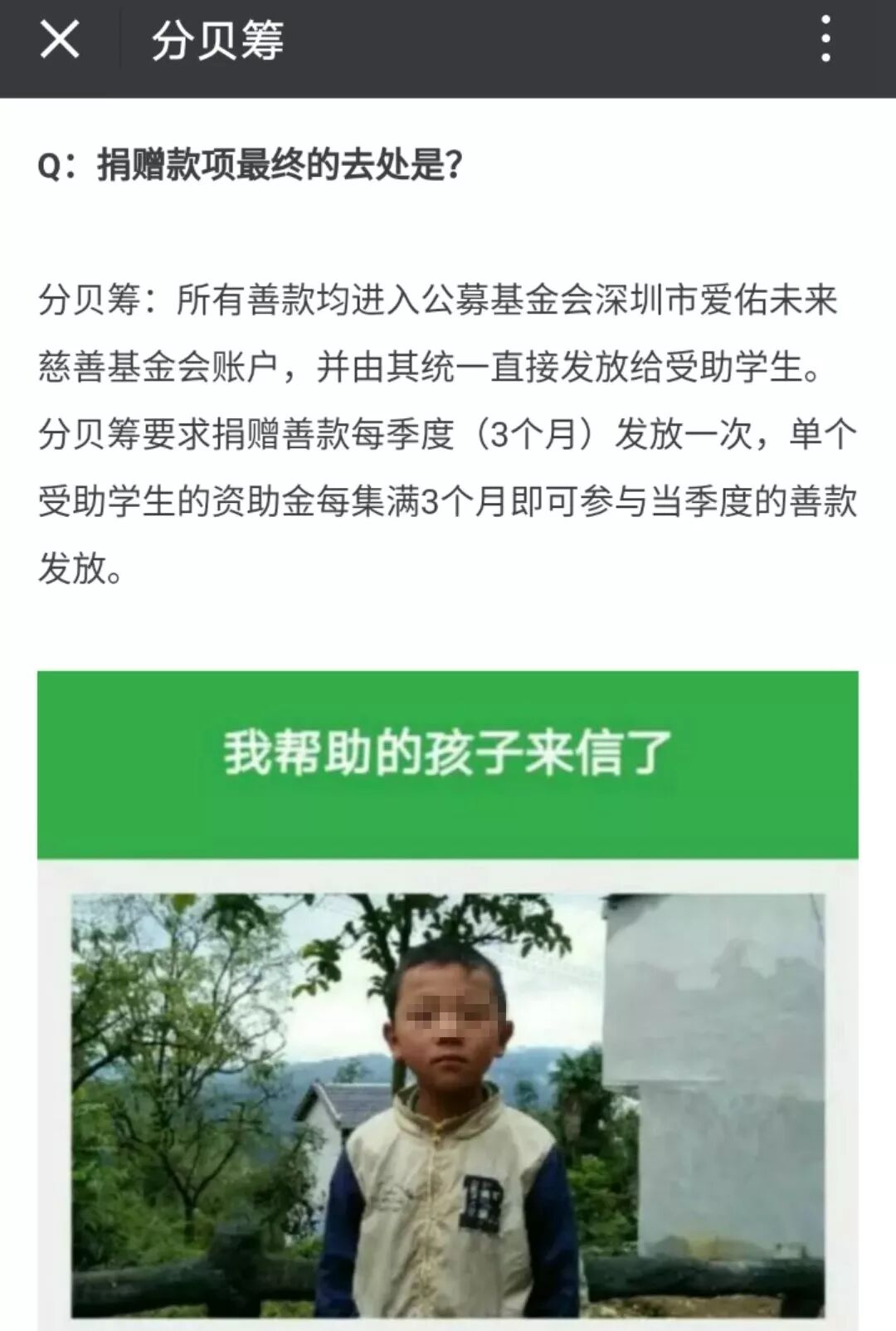 “分贝筹”同时回应称,所有善款均进入公募基金会深圳市爱佑未来慈善基金会账户,并由其统一直接发放给受助学生。