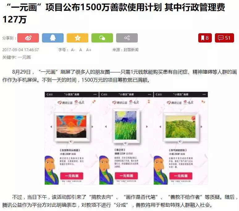 据媒体调查,该活动由深圳市爱佑未来慈善基金会联合平台“分贝筹”发起。而据封面新闻报道,今年8月,前者联合腾讯公益组织的“一元购画”捐款活动曾在朋友圈刷屏,但也引发社会争议。