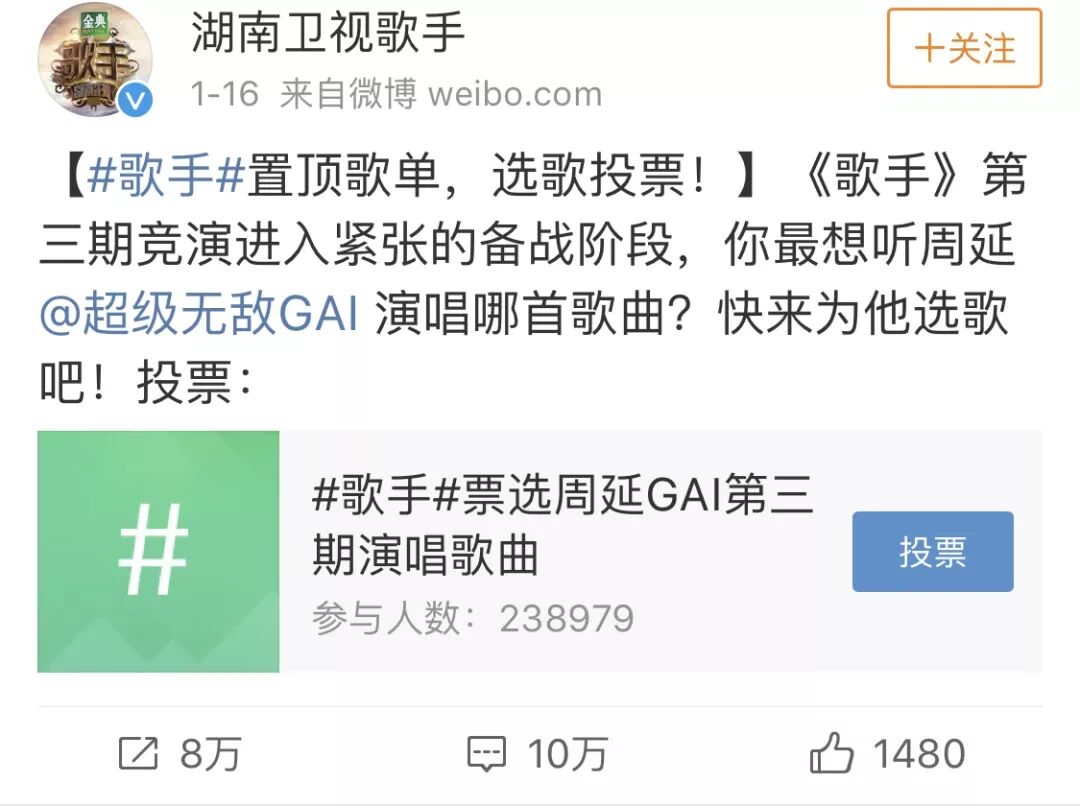 挂官微头条的还是1月16日让大家投票“置顶歌单,第三期选歌投票”为GAI选歌的微博。