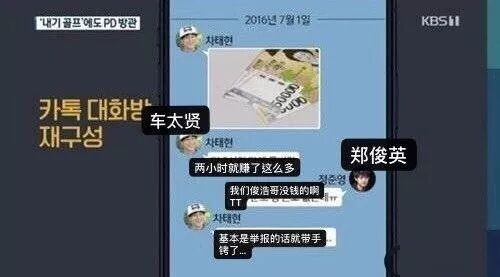 3月16日晚,KBS曝光了包括郑俊英在内的《2天1夜》成员聊天群的对话,据对话显示,知名演员车太贤、电视人金俊浩等均涉嫌数百万韩元的非法"高尔夫赌博"。据悉,该内容是在郑俊英被查的手机中发现的,14日郑俊英向警方提交了3部手机,15日首尔地方警察厅搜查了郑俊英住所。