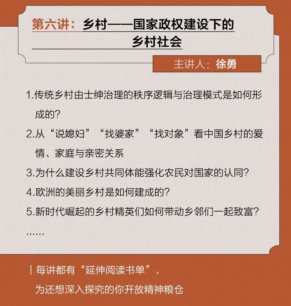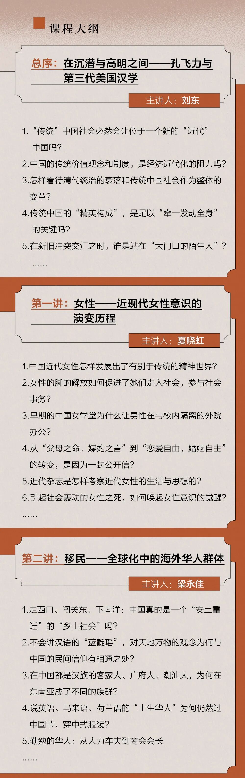 兼具海外汉学研究视角和每一个主题,都以海外汉学家对相关领域的研究作为切入点,中国学者基于自己的研究做出回应或者补充,二者跨越时空,遥相呼应。课程探讨“现代中国”形成前后的重要社会议题,用更开放的视野,为我们理解中国社会梳理出一条较为清晰的线索。追溯历史,观照当下。(打卡截至2023年2月1日,详细统计规则见课程首页-打卡规则)