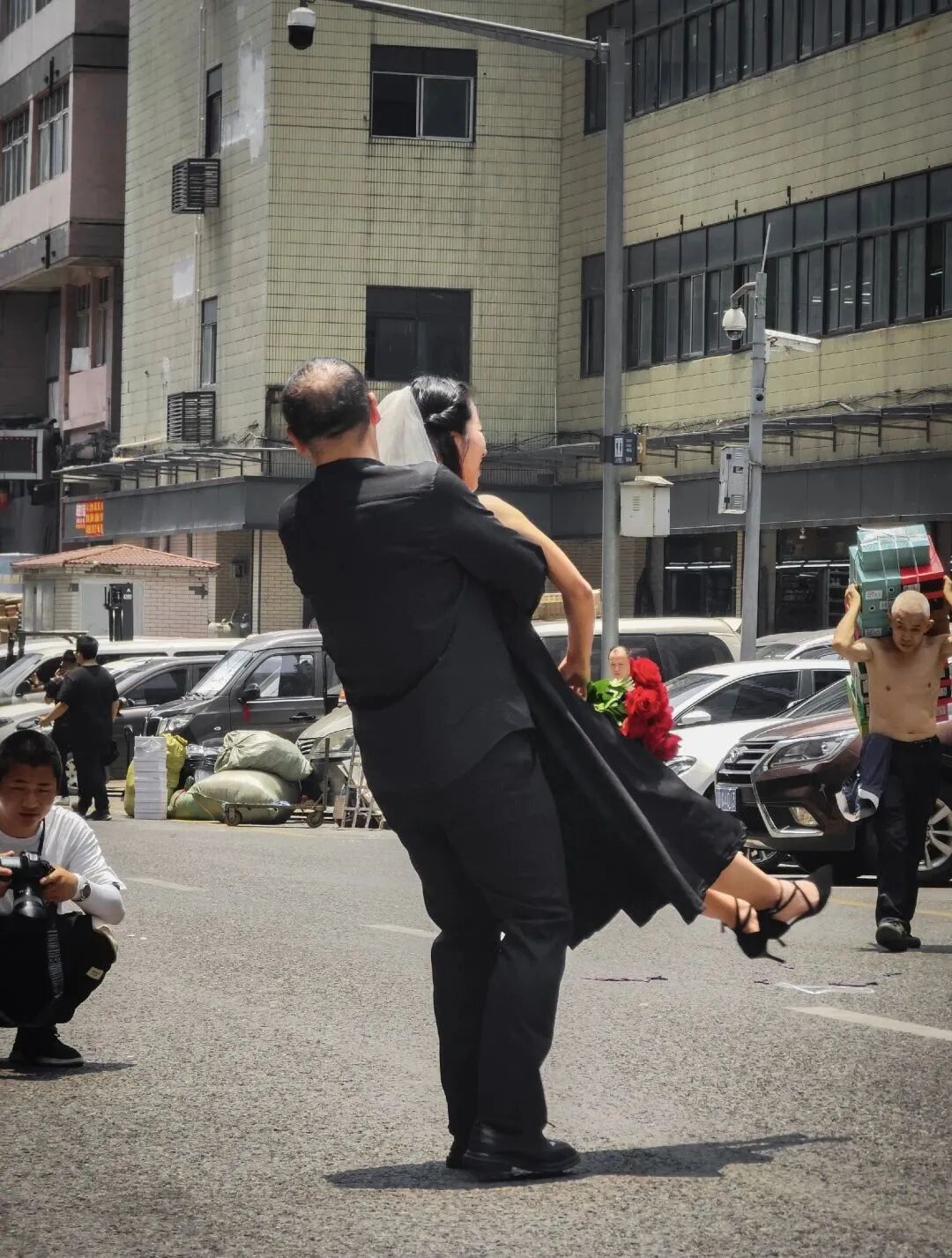 冯杰的生活经验里,很少见到新人在这样平常、甚至“不美”的街道里拍摄婚纱照。杂乱的背景,扛着货物的工人,让爱情的喜悦显得那么过于引人注目。