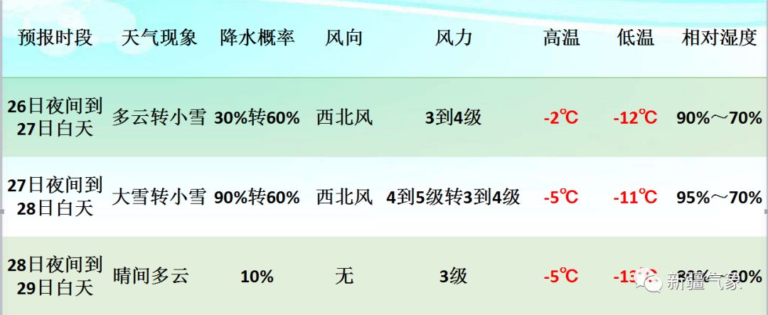 26日夜间到27日白天,受强冷空气的影响,北疆地区有降雪,伊宁、阿勒泰等地有大雪,其它地区有小到中雪;东疆南疆地区以多云天气为主。949小编提示:伊犁州、塔城地区北部等地风雪明显,需加强公路干线的积雪清理工作,同时还需防范大风天气给交通运输带来的不利影响。