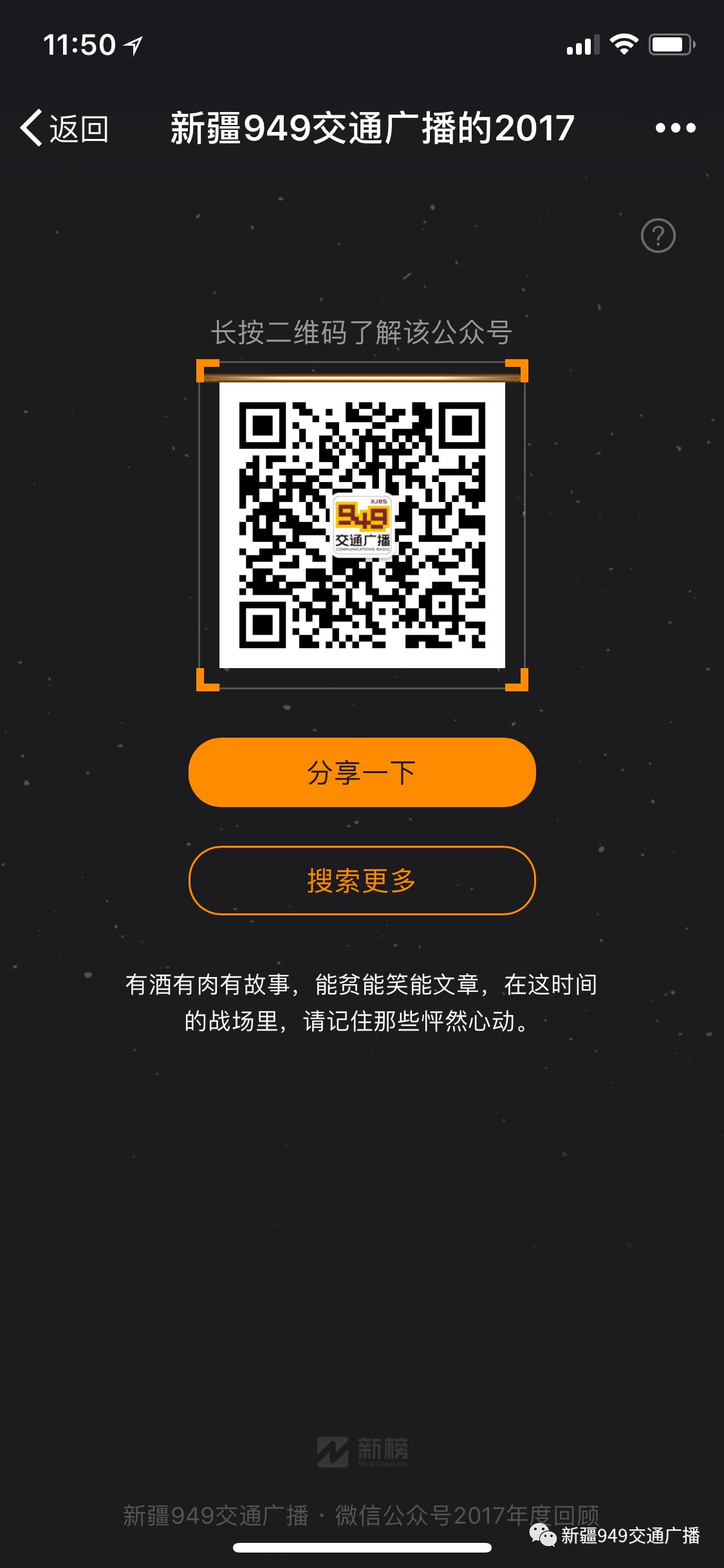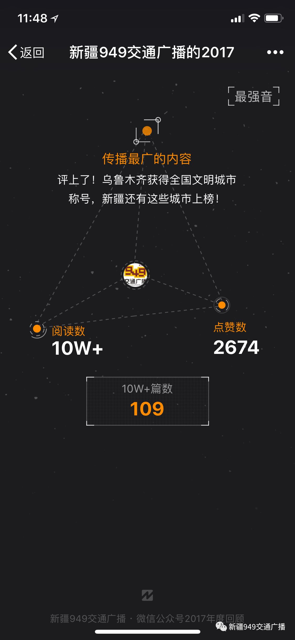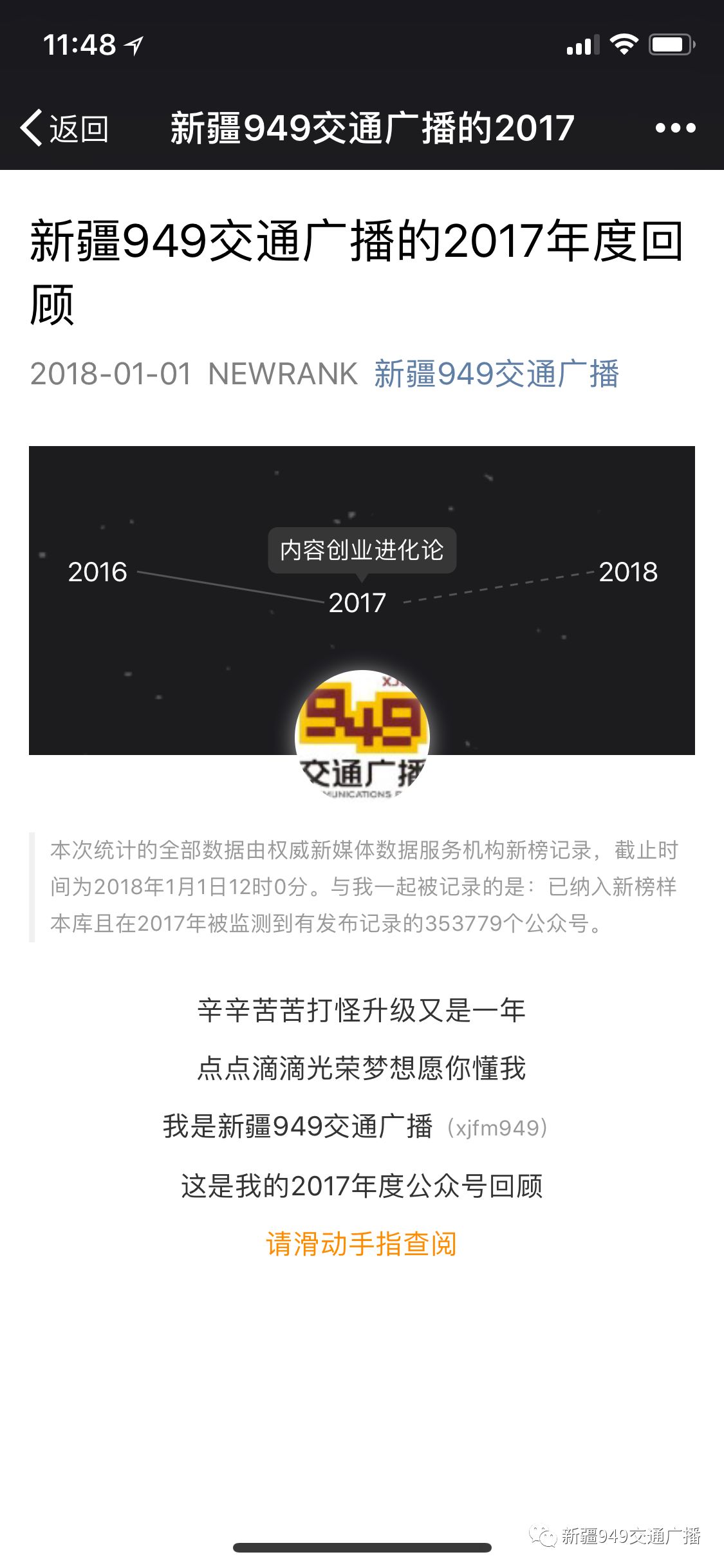 原来,这是“新榜服务”推出的微信公众号2017年度回顾内容。您关注的949交通广播微信在这一年里也取得了优异的成绩哦!如果说,每一篇推送凝聚着949工作人员的汗水与辛勤,那么,每一条微信的阅读与点赞更离不开您的关注与支持!