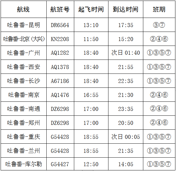 北京—吐鲁番航线由中国联合航空采用波音B738机型执飞,每周二、四、六共三班,航班号为KN2207/8,航班执飞计划时间为:KN2207于7时15分从北京大兴机场起飞,11时05分到达吐鲁番;KN2208于11时50分从吐鲁番起飞,15时20分到达北京。此前的7月23日起,吐鲁番机场开通南通—郑州—吐鲁番往返航线,该航线由东海航空有限公司运营,每周执行6班次。此外,该机场还将计划开通多条旅游包机航线,继续织密航线网络,助力当地旅游业发展。