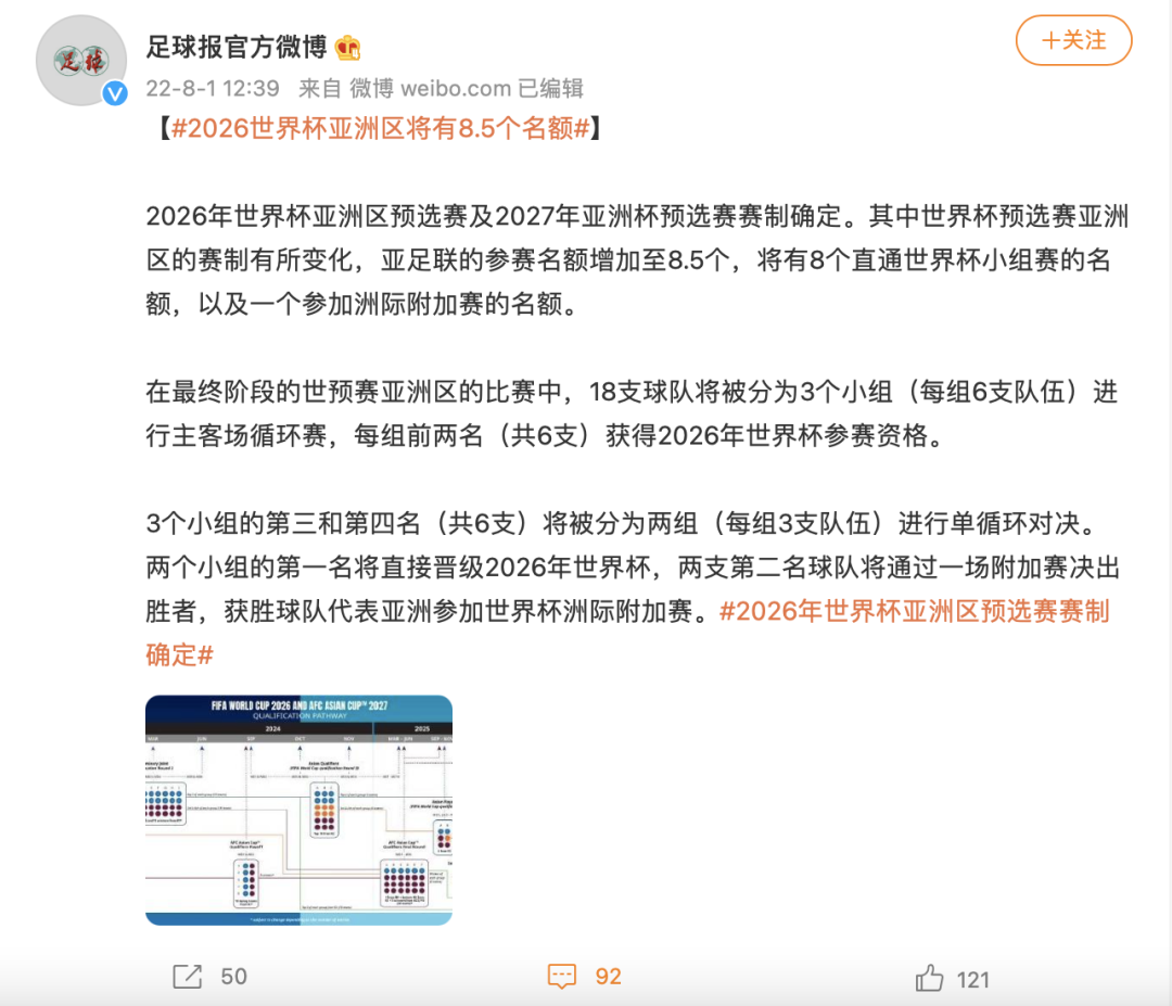 2026年世界杯亚洲区预选赛及2027年亚洲杯预选赛赛制确定。其中世界杯预选赛亚洲区的赛制有所变化,亚足联的参赛名额增加至8.5个,将有8个直通世界杯小组赛的名额,以及一个参加洲际附加赛的名额。