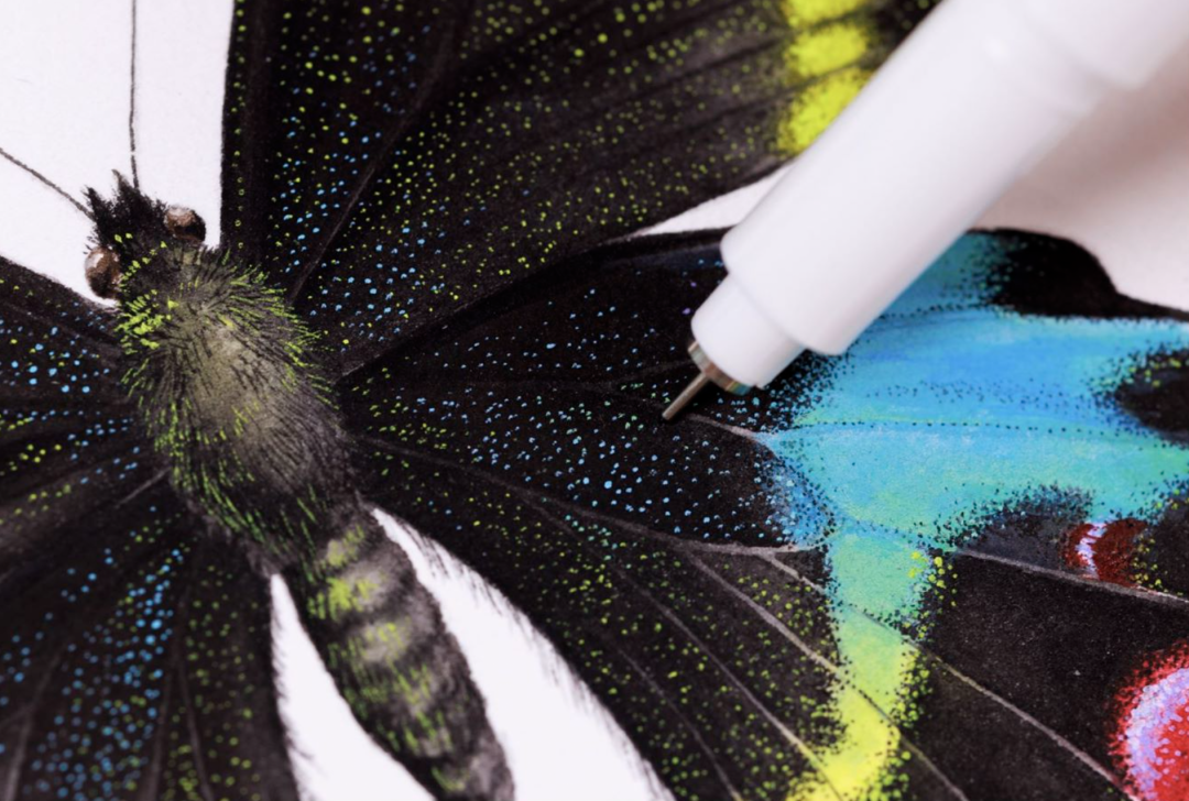 拿蝴蝶翅膀来说,为了让蝴蝶翅膀鳞片的质地更好呈现,在反复尝试了多种绘画方式之后,最终选择用点绘的方式画成,平均每只蝴蝶翅膀上的点绘数量将近8000-10000个,经常是只画了一只蝴蝶翅膀上的点,一天就过去了。
