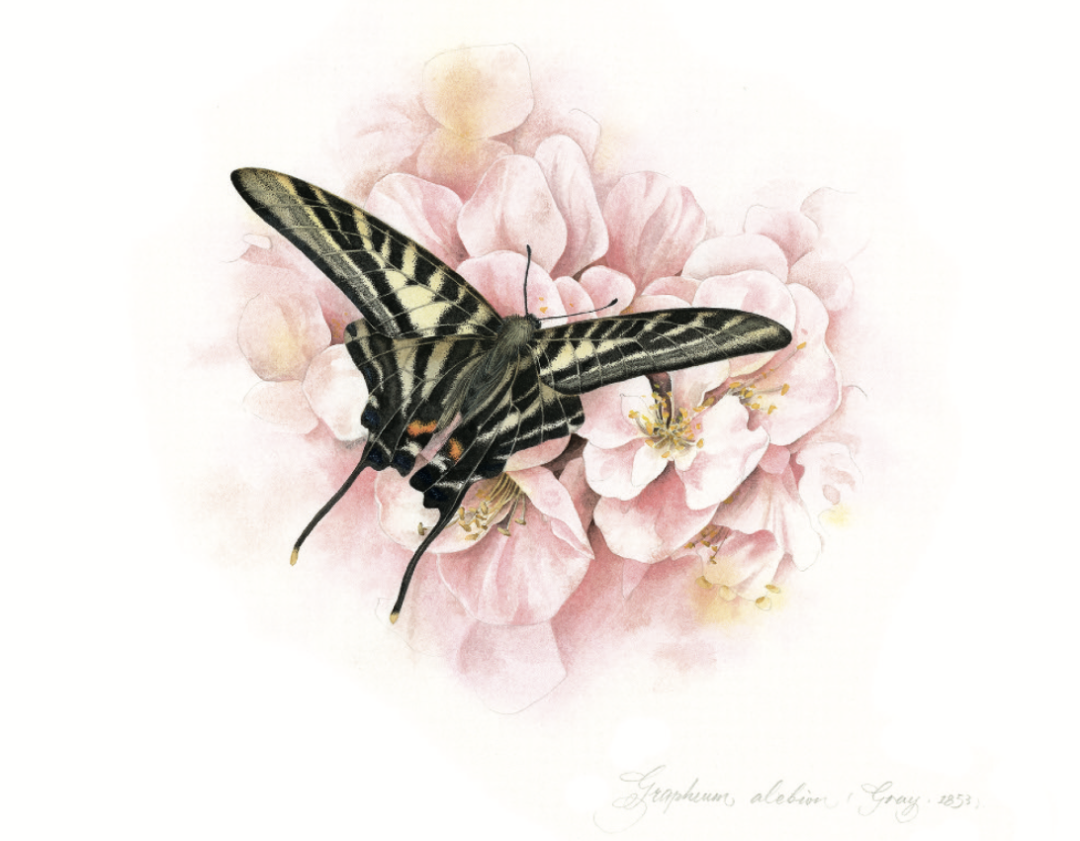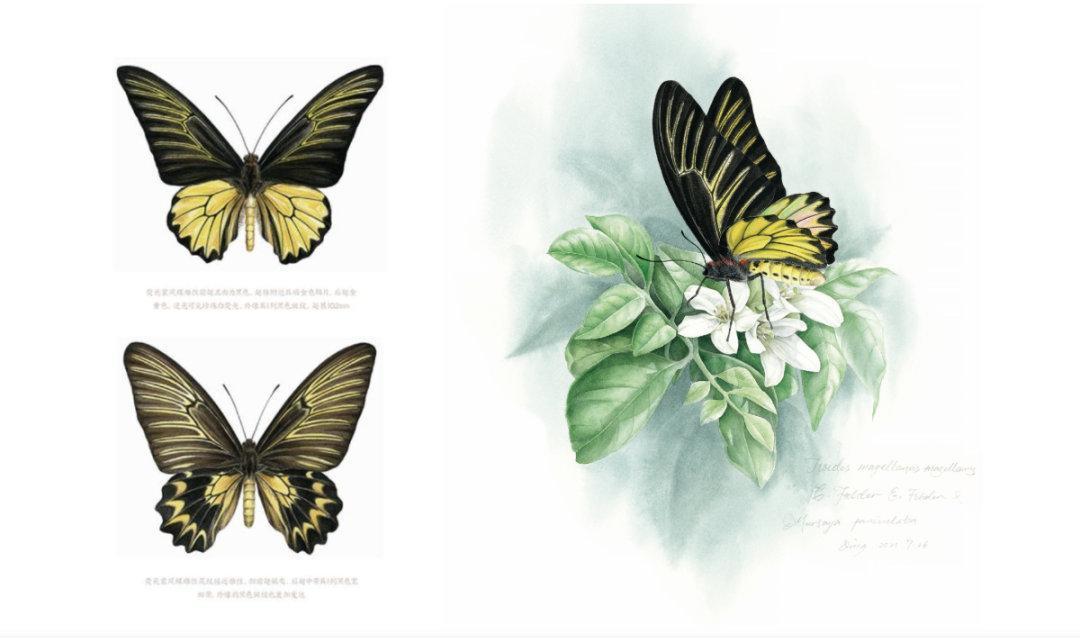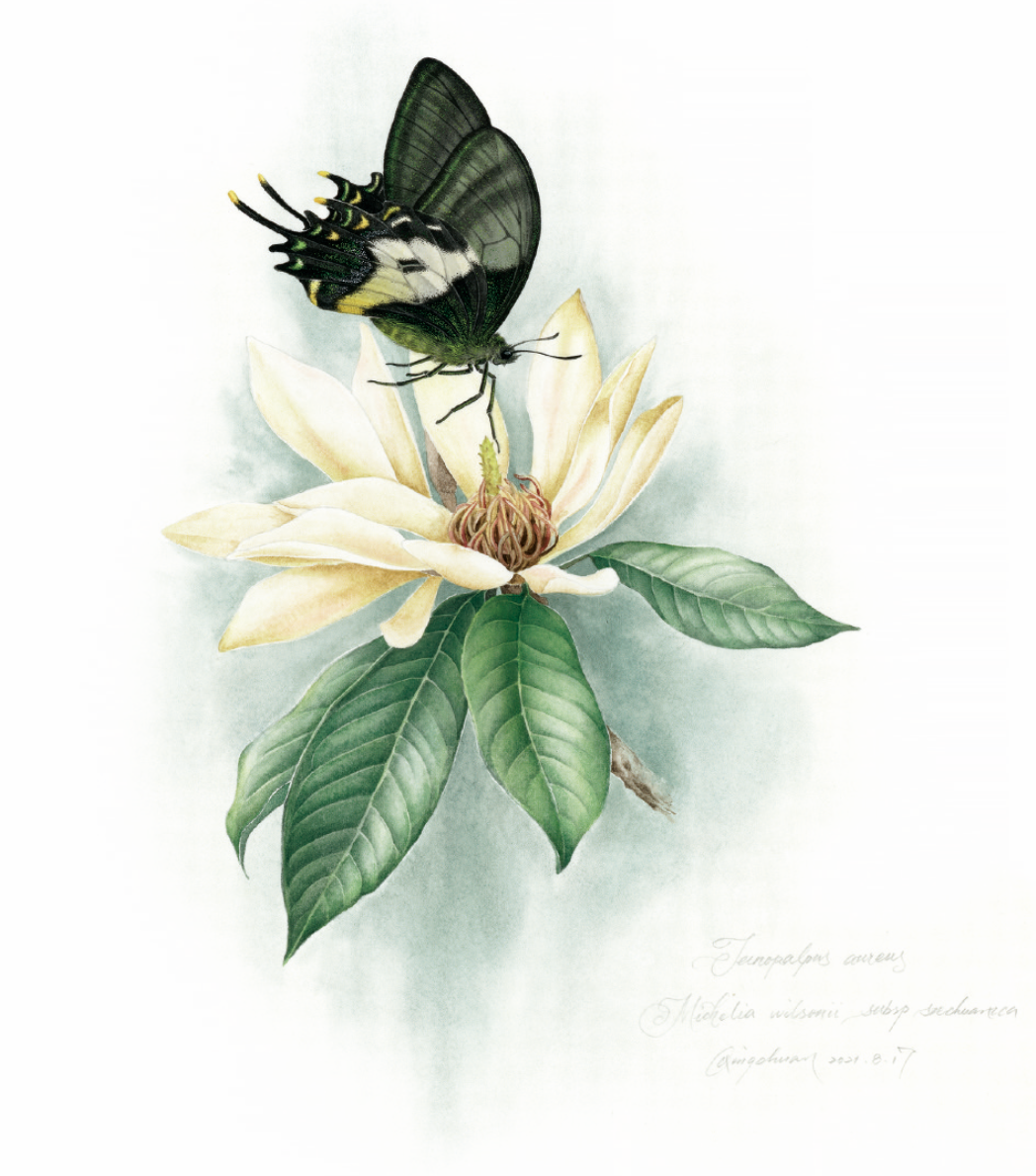 以我国唯一一种一级保护野生蝴蝶金斑喙凤蝶为例,在它们生活的区域花期和羽化时期刚好吻合的植物,比较有代表性的是川含笑,综合多张参考图,经过反复修改和调整,才让它在画纸上呈现出最美丽且准确的姿态定格。