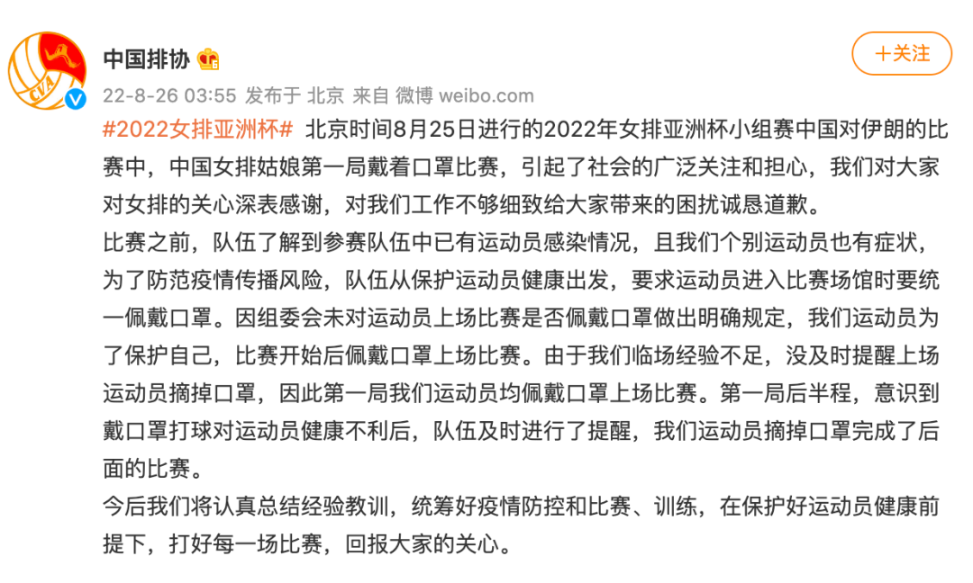 北京时间8月25日进行的2022年女排亚洲杯小组赛中国对伊朗的比赛中,中国女排姑娘第一局戴着口罩比赛,引起了社会的广泛关注和担心,我们对大家对女排的关心深表感谢,对我们工作不够细致给大家带来的困扰诚恳道歉。