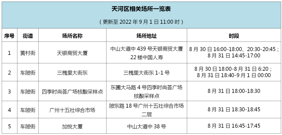 今日(1日)12时,据“广州天河发布”,因疫情防控需要,请在相关时段到过以下场所的人员,立即向所在社区联系报备,并前往就近的核酸检测点进行核酸检测,同时按照社区和疾控部门要求配合做好健康管理,相关场所名单后续将按实际情况更新。