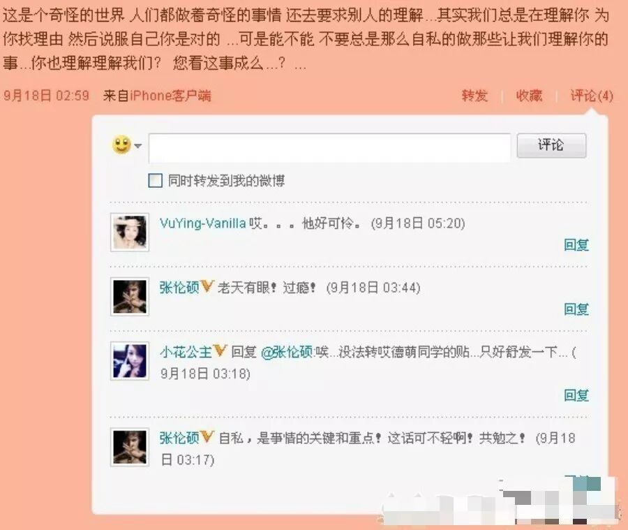 张馨予也曾经发文声讨李斯羽,张伦硕还在下面回复老天有眼。