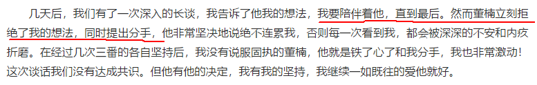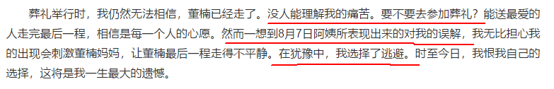 还说自己后来跟董楠和好了,两个人还牵着手跟双方父母道歉了,但是董妈妈还是对她心有芥蒂。以至于后来自己没有去参加追悼会,都是因为不想刺激董妈妈。