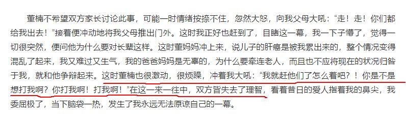 而李斯羽这时候刚好过来,董妈妈继续指责她,董楠冲出来说就是要敢李斯羽父母走,怎么着,打我啊,所以李斯羽才打了那一巴掌。