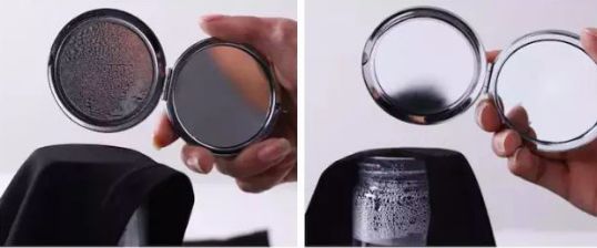 左图:冰丝降温T恤透气性明显,热气透过衣服散发到镜面的水珠便能很好的证明其透气性能
