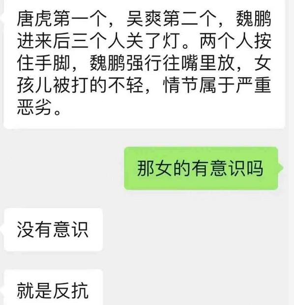 前几天汪峰发了新歌,不少吃瓜群众表示无聊许久的内娱终于有救了。所以这次阿美早早蹲好了,虽然大瓜没有,但是小瓜不断,至少排面还是给足了的。从黄子韬徐艺洋的恋爱绯闻,到张庭林瑞阳夫妇公司名下96套房产被查封,再到拔起萝卜带出泥的陶虹。以及今天热搜上一连串的人名,从内娱到国际,蕾哈娜李溪芮到阿沁刘阳半藏森林还有一个手滑点赞的孙红雷。谁也不许再说汪峰塌房了,汪峰没塌,汪峰定律还是准的,不过就是哥年纪大了,反应跟着有点迟缓罢了哈哈哈哈哈。不过让人吃瓜吃到yue的,其实是那几个不认识的名字:魏鹏、唐虎、吴爽。最近有网友爆料,安徽卫视当家花旦余声的老公魏鹏疑似深夜被抓。啊?余声又是谁?说起来余声作为卫视主持人也算是娱乐圈的公众人物。也就是现在安徽卫视不太行了,不然这个姐的名气,应该也能和其他台当家主持人差不多。从网友截图的聊天记录里,不难还原这三个人渣对一个女孩干了什么事,三人先后进屋轮流与女孩发生关系,女孩没有意识只是反抗。总之,这已经不是道德层面上出轨能得说过去的,他们这是在犯罪,真的很刑!!!三个人渣据说是好朋友,余声老公魏鹏貌似是个富商,唐虎是个知名配音演员,另一个吴爽还没对上号,好像是和魏鹏一个行业的老板。被侵害的女生被曝是一个学艺术的女大学生,事情发生之后,这三个男的想花钱私了。女生要价一千万没谈拢,还价到一百万,三男的还想分期,然后女生一气之下就把他们告了,现在应该是住进去踩缝纫机了。不管是多少钱目前已经走上刑事案件程序,鉴于情节恶劣,即使女生那边拿钱签署了谅解书,这三人还是要坐牢,好像是刑期会短一些。让他们三个在娱乐榜待着也太晦气了,送他们上社会新闻吧。我们每天都在感叹女孩长大太艰难了,结果转头现实版的《扬名立万》就上演了。三个老板就为了自己那点龌龊事,想用几百万就换取女孩的一辈子,未免也太离谱+无语+气愤,看到这事儿,很难不气鼓鼓。事情发生的时候,魏鹏的老婆余声刚录完节目,余声事业目前还没受到什么实质性的影响,只是唐虎的配音作品被通知要全部下架。一听还是个知名配音演员,阿美好奇去搜了搜,简直开了眼直呼救命,很多还都是guo字头的作品,标准的红色系啊。难以想象拥有这么牛X的履历,干出的事儿竟然如此丧尽天良,配得上“艺术家”三个字??表面看着光鲜亮丽,背地净干些鸡鸣狗盗的事情,阿美好奇去翻了他的微博,好像他还是个培训播音主持的艺考老师!!!阿美想到这次受害者也是个艺术生,我愣住了,不敢往下想。从唐虎微博里能看出来,他和余声都是安徽卫视的老同事了,两人经常在工作场合同时出现。所以唐虎和魏鹏能成好朋友倒也在情理之中,但我不觉得唐虎和魏鹏去干那事的时候,还能给余声打个招呼。就是说,唐虎明知道魏鹏这样,可他每天又是怎么心安理得地面对余声的。吴爽还对不上号可不影响我们骂他!三个人谁也别想跑!犯事的是魏鹏,余声事业还没被自己的渣男老公牵扯到,说到底余声也是受害者之一。甚至很多并不怎么被大众熟知的私生活,也顺便跟着又被扒了出来,姐:这热度不要也罢。如果不是因为这件事,我竟然不知道余声当年竟然还和何润东传过绯闻,就好古早的瓜啊。余声目前也算是安徽卫视的一姐,曾经拿过世界小姐选美大赛中国区总冠军,有颜值有能力,虽然这个姐不红但大家一定脸熟。她主持了多年安徽卫视的《国剧盛典》,还有《超级演说家》、《男生女生向前冲》这些爆红节目。想必不少网友都还嗑过余声和王乐乐的CP,两人经常搭档主持,可惜王乐乐人家有自己的官配。而余声也转头答应了自己青梅竹马魏鹏的求婚,当时觉得青梅竹马这个词好甜啊,现在,呸只想说句美女快跑。19年5月份,魏鹏在自己好友婚礼上高调求婚,当时还有网友骂他们喧宾夺主,余声出来回应说是想好事成双。19年10月份,两人正式举办了婚礼,金星金姐还去现场当了证婚人。金姐说自己很少参加婚礼,因为眼瞧着不像能在一起过日子的人,祝福的话实在说不出口。她说认识余声和他先生很开心,每次见到漂亮单纯的小姑娘忍不住希望她赶紧有个好归宿。如今看来,魏鹏和好归宿这个词实在是不沾边,今天这个瓜,是金姐自己看了也觉得晦气的程度。当时余声和魏鹏结婚的时候,就有很多人表示不理解,不理解好好一个大美女为什么非要嫁给一个猪头三。我知道不礼貌,但我就这么称呼他了。大家质疑他老公家里有矿是个富二代,余声自己回应他家没矿,就是喜欢了女主21年而已。有人问那么多同学为啥偏偏选中了魏总,余声说:因为爱情,因为懂得。结婚之后两人也没曝光过什么不和啥的,可能是因为糊吧没人盯着,余声还经常在社交平台秀秀恩爱。还有不少网友在线催婚二胎,甜蜜小日子过得还挺有模有样。上个月底魏鹏还带着儿子,在社交平台上和余声表忠心,说这是保护你的两个男人。不少马后炮网友表示很早就看出魏鹏这人不咋滴,抛开玄学因素说魏鹏长相就不像个老实人。有人说余声对她老公一直都比较热情主动,婚礼上余声哭的稀里哗啦,她老公淡定的要死,好像与他无关。还有人说余声驾驭不了魏鹏,直播时候找老公帮忙,老公也不搭理她,让老公别抽烟老公也不听。更离谱的是有人爆料余声之前离过婚,所以才这么主动。