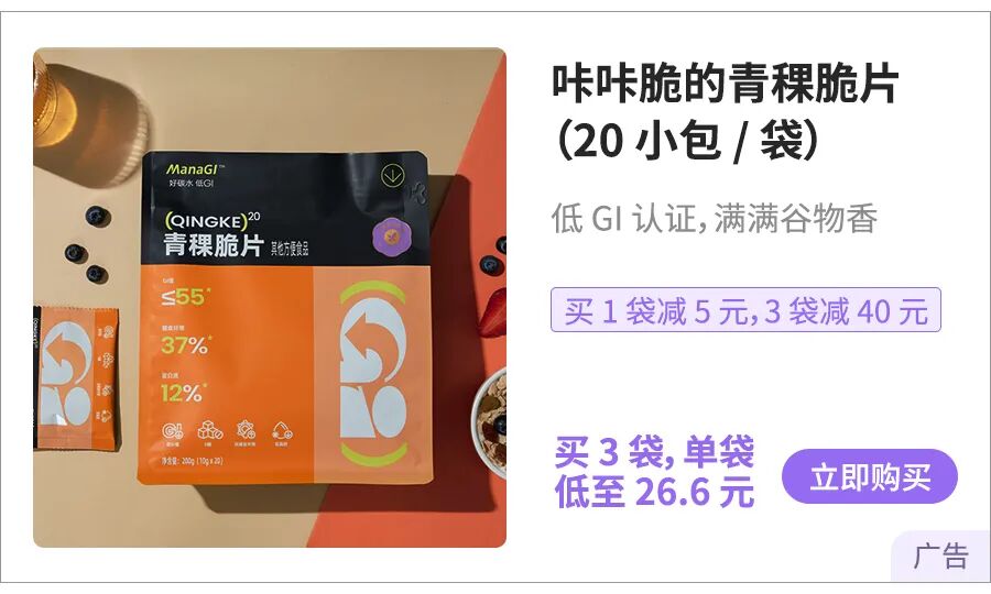 来,给大家一个比较省心的选择,来自咱们丁香医生自家出品的真 · 低 GI 食物——青稞脆片。