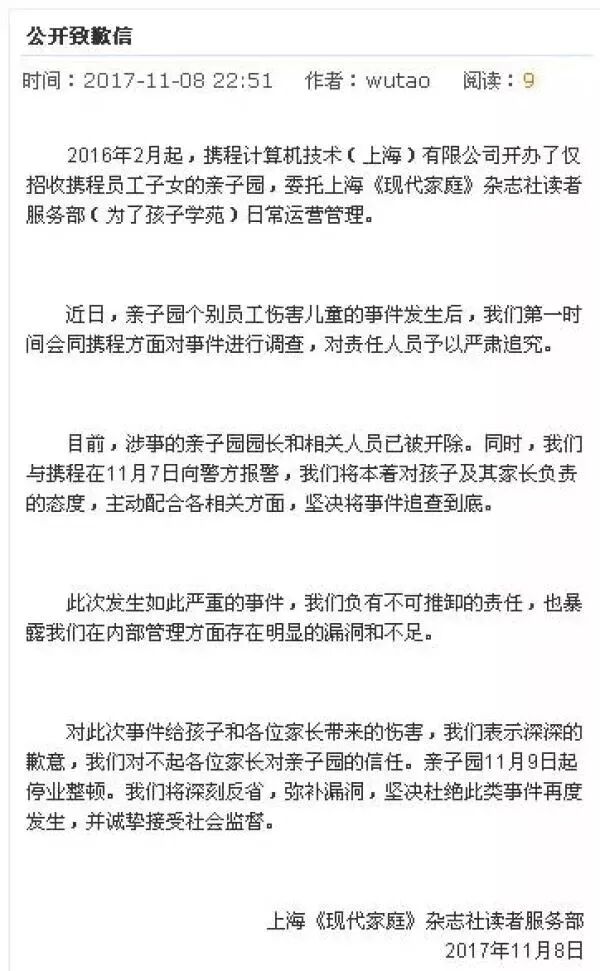 携程亲子园虐童事件后,携程CEO孙洁深夜发内部邮件披露初步处理方案与整改说明,受委托第三方发出致歉信。