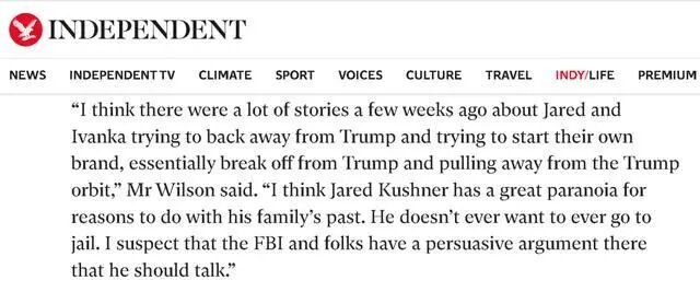 而来自美国共和党内部的“反特朗普”小团体“林肯计划”的政策分析师里克·威尔逊(Rick Wilson),则在接受美国微软全国广播公司(MSNBC)采访时调侃说,他认为特朗普是被自己的女婿库什纳告发的,理由是库什纳的父亲就曾因为在经营地产公司时违法而坐过牢,这令库什纳产生了心理阴影,怕如今会跟着特朗普一起坐牢,所以才将自己的岳父举报。