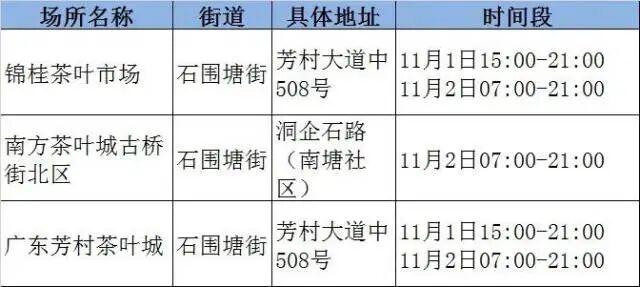 2 | 花城街 | 石岗村党群服务中心核酸采样点 | 广州市花都区花城街石岗村党群服务中心 | 11月1日14:50-15:00; 11月2日15:40-15:50 |