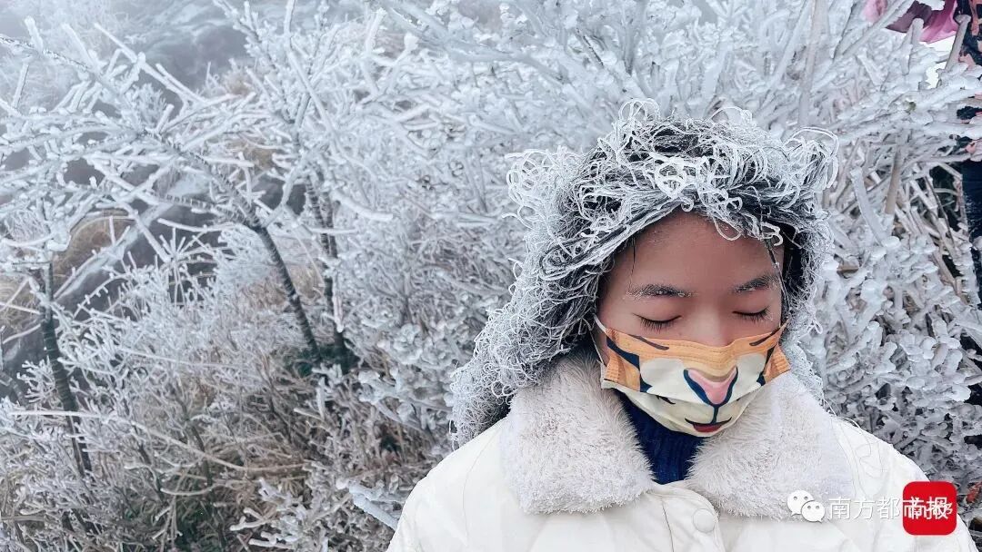 金子山高峰最低温度低至-3℃,烟雾缭绕,大面积雾凇。南都记者 高永佳 摄