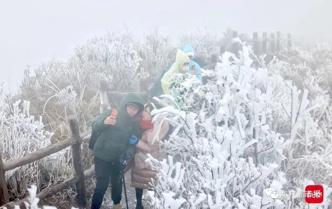 金子山银装素裹,游客伸手触摸树枝上的冰挂。