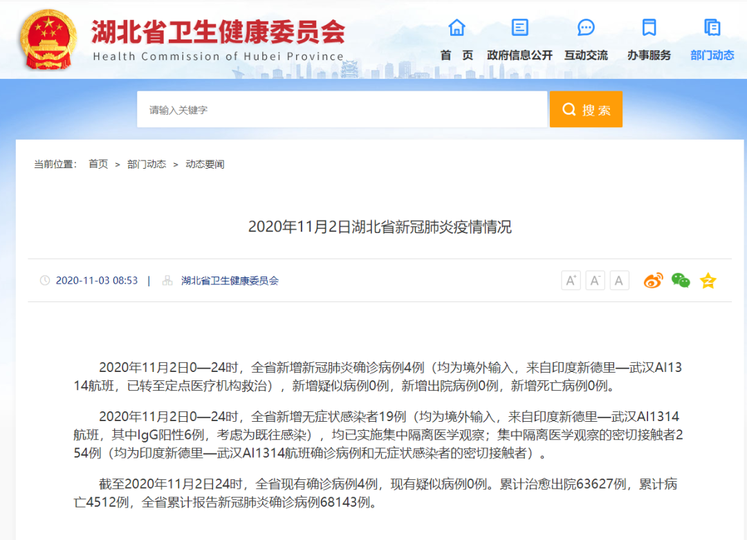 据武汉市卫健委官网消息:2020年11月2日0-24时,我市报告4例境外输入性新冠肺炎确诊病例和19例境外输入性无症状感染者,均为10月30日晚乘坐印度航空AI1314航班飞抵武汉天河机场的乘客。