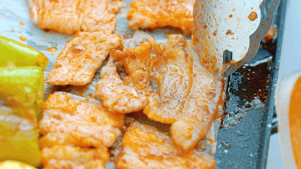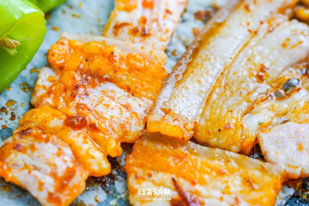 【精品手切五花肉】也是每次烤肉必点了吧,大片五花肉烤出油汪汪、嗞啦嗞啦的效果,建议开小火一点、避免崩油。