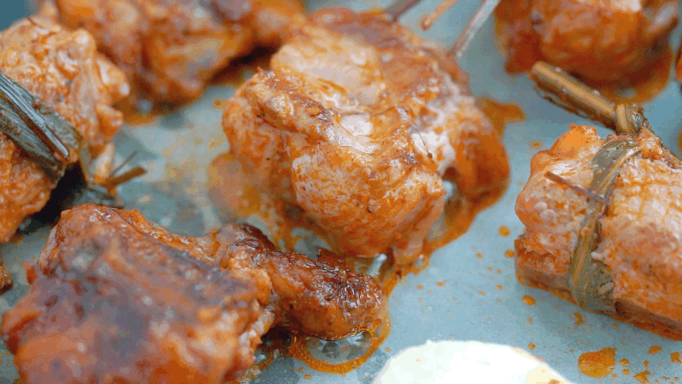 【香茅草排骨】用香茅草捆好的厚肉排骨块排排烤,每次翻面香茅香气都更浓郁一些,老诱人了。