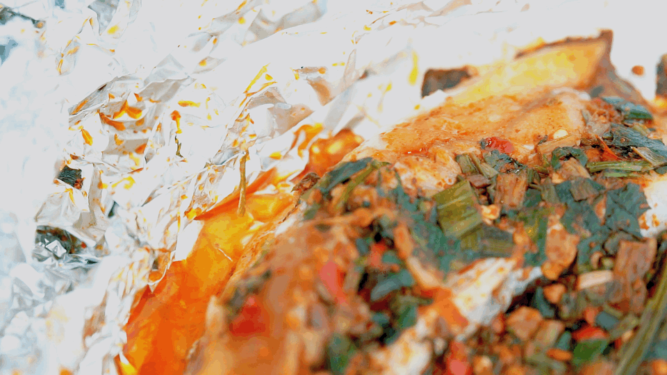 【云南傣味罗非鱼】适合多人分享抬排面,整只鱼摊在锡纸盒中,直接上盘烤,非常方便。需要小火慢烤20分钟,建议最先烤鱼。